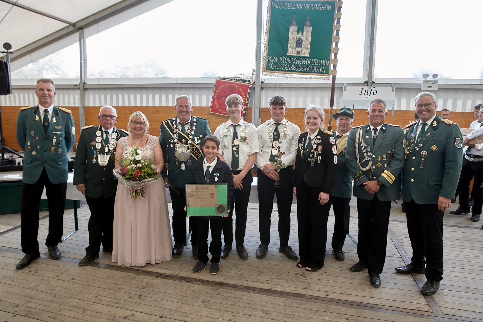 Fand der erste Teil des Tages auf der Anlage des örtlichen Sportvereins statt, erfolgt nun der Umzug zum Festplatz. Dort fanden die Schießwettbewerbe auf den Vogelstandanlagen statt. Neuer Schülerprinz des Landesbezirks Niederrhein wurde Jannik Krebbing aus der ausrichtenden Bruderschaft und Florian Hoferichter tat es ihm gleich in der Jugendklasse. Beide schossen den Rumpf von der Stange, nachdem weitere Preisschützen den Kopf, den linken und rechten Flügel und den Schwanz zuvor erlegt hatten.